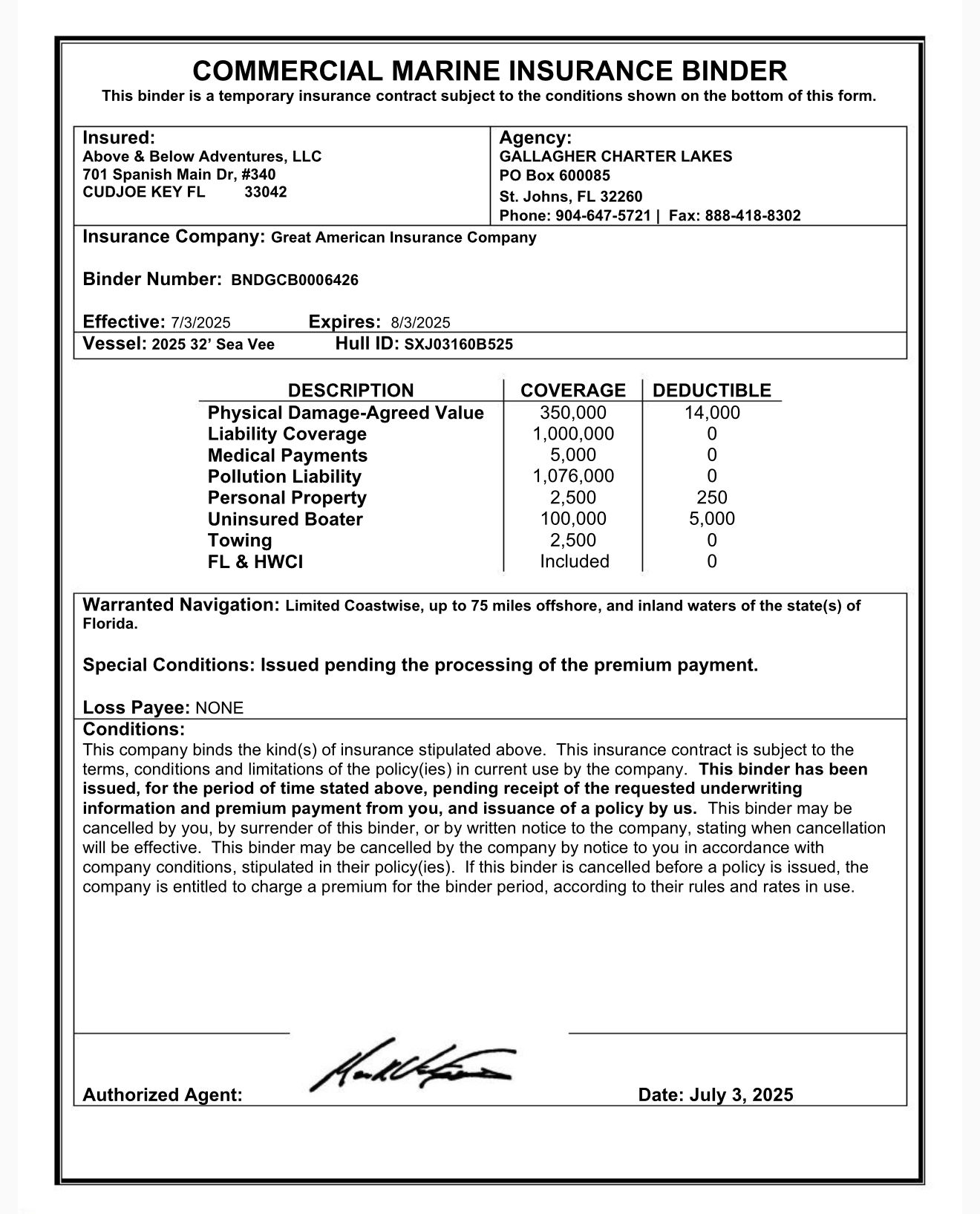 Your adventure takes place aboard a brand-new 2025 custom 32’ SeaVee powered by twin Mercury 300s, fully equipped with the latest electronics, a tower, JL sound system, and even Starlink Wi-Fi. The boat is tournament-rigged but family-friendly, designed for both serious sportfishing and relaxing days exploring the Keys.