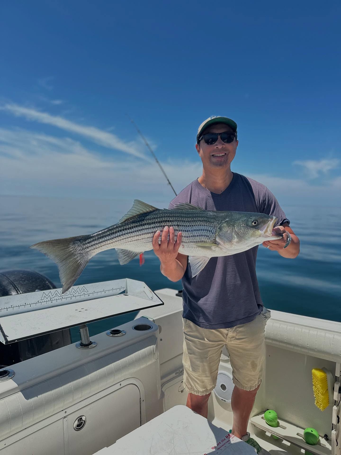 Striped bass fishing around Cape Cod continues to produce steady action through the week of July 4th. Anglers have been enjoying consistent hookups with fish holding inshore and around structure, especially during early morning and late evening tides. Live bait and topwater plugs have both been productive, with many fish falling in the 28–36 inch range. The warm summer pattern has settled in, keeping the bite strong as schools of bass stay active in cooler, oxygen-rich waters. Working drop-offs, rips, and sandbars has paid off, particularly for those targeting moving water with light tackle setups. Weather conditions this week have been favorable, creating solid opportunities for both new and seasoned anglers to get on fish. Captain reports a few open slots this week—perfect timing if you're looking to get on the water while the bass bite is still firing. Don’t miss your chance to experience Cape Cod fishing at its mid-summer best!