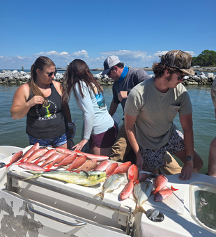 Hot bite and happy crew! Summer fishing in Gulf Shores, AL was in full swing as I took Tiffany and their crew out for an afternoon adventure with Bottomed Out Fishing Charters. The partly cloudy skies with a chance of rain didn't dampen our spirits as we set out at 2:00 pm for our 4 Hr Trip - Nearshore/Offshore. With six eager anglers aboard, we were ready to make the most of what the Gulf had to offer. The weather kept us on our toes, but that's all part of the excitement when you're out on the water with Bottomed Out Fishing Charters. Once the stage was set, we got down to business, employing a mix of surf fishing, pier fishing, and deep sea fishing techniques to maximize our chances. The versatility paid off as we targeted different spots and depths. Our efforts were rewarded with some nice catches, including Red Snapper measuring 11 inches and Grey Snapper at a solid 15 inches. These snappers put up a good fight and gave Tiffany and their crew a taste of what Gulf Shores fishing is all about. We wrapped up the trip with smiles all around, proud of our catches and the memories made on the water. Gulf Shores is a prime destination for anglers looking to experience the best of what Alabama's coastline has to offer. Whether you're casting from the surf, trying your luck off the pier, or heading out to deeper waters, there's always a chance for a great catch. Our 4 Hr Trip - Nearshore/Offshore is perfect for those wanting to sample a variety of fishing techniques and target different species. It's an excellent option for families, friends, or anyone looking to spend a productive afternoon on the Gulf. If you're thinking about planning your own fishing adventure in Gulf Shores, AL, I'd love to have you aboard with Bottomed Out Fishing Charters. Our 4 Hr Trip - Nearshore/Offshore (PM) is a fantastic way to experience the best fishing the area has to offer. Whether you're an experienced angler or new to the sport, we've got the knowledge and equipment to ensure a memorable outing. From the thrill of surf fishing to the excitement of deep sea fishing, we cover it all. Don't miss the chance to reel in your own Red Snapper, Grey Snapper, or whatever else might be biting. Summer is a great time to fish these waters, with plenty of action and the possibility of a variety of catches. Book your trip with us, and let's make some fishing memories together in the beautiful Gulf Shores. Remember, at Bottomed Out Fishing Charters, we're committed to providing the best experience possible, no matter the weather or conditions. So grab your crew, and let's hit the water for some prime Gulf Coast fishing action!