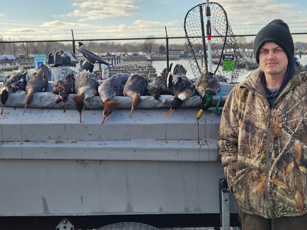 For hunters, CJB Outfitters delivers premier Lake Erie duck hunting trips on a custom 18’ Ocean Duckwater blind boat powered by a 150HP Evinrude outboard. Guided duck hunting Lake Erie adventures are perfect for those looking for a unique experience. With Lake Erie cast and blast packages, you can combine the excitement of hunting and fishing into one action-packed outing. Captain Chip’s expertise as an Ohio waterfowl hunting guide ensures you’ll have the best opportunities for success, whether you’re pursuing ducks, geese, or both.