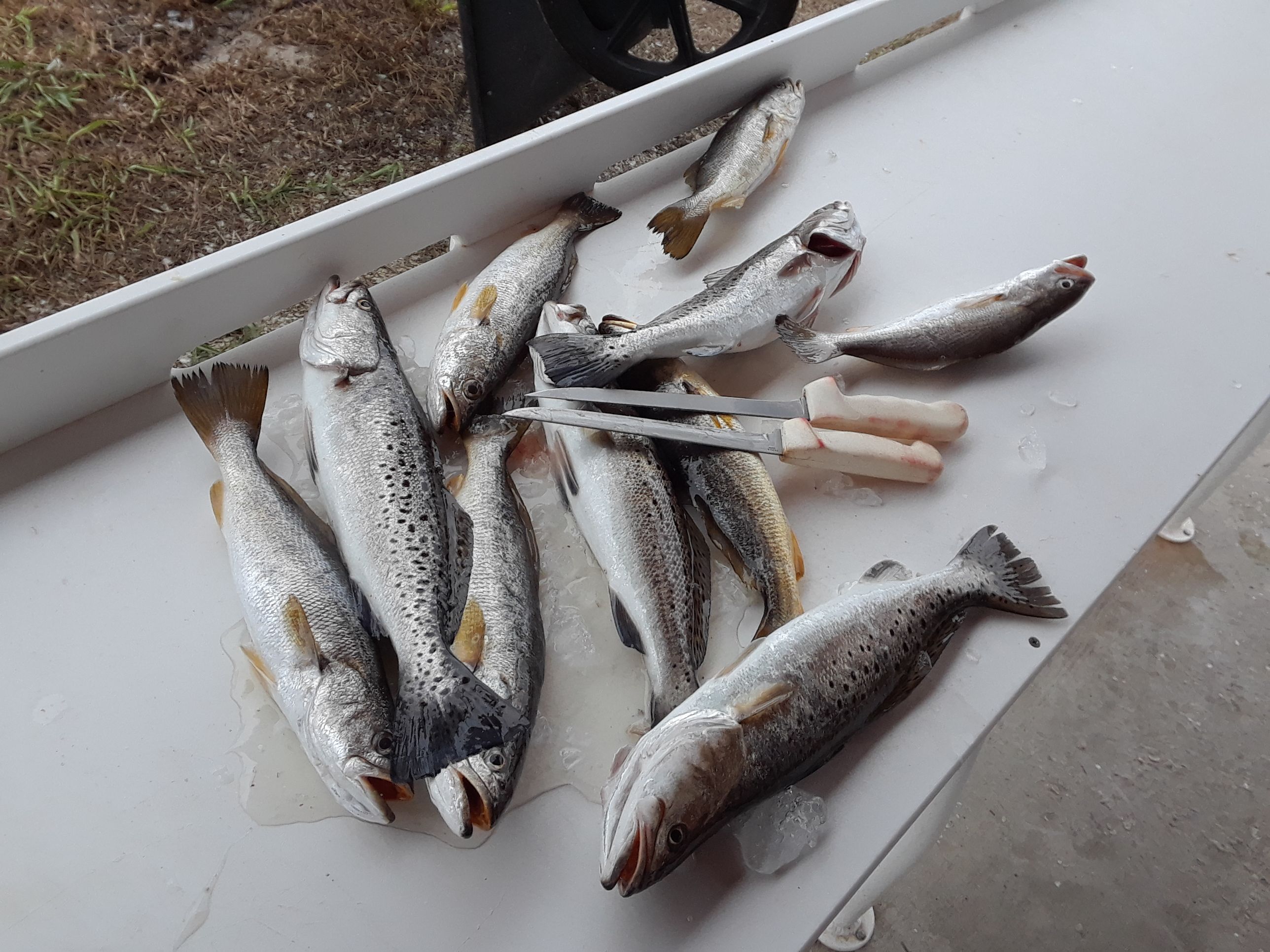 WENT OUT TO CHECK MY TRANSDUCER PLACEMENT ON MY NEW 12' SIMRAD SOUNDER/GPS/CHART PLOTTER, AND WHILE CRUISING AROUND, DECIDED TO FISH THE PERFET TIDE, FOR MY FAVORITE FISH, THE SPECKLED SEA TROUT. I CAUGHT A DOZEN EASILY AS THE TIDE GOT EVEN MORE PERFECT ON A OLE FAVORITE SPOT IN A CREEK. CASTED MATRIX SHAD SOFT PLASTICS ON A JIG HEAD, AND WACKED AND STACKED A DOZEN TROUT IN NO TIME. WENT BACK AND FILLETED MY WHOPPING 5 THE STATE ALLOWS THESE DAYS.