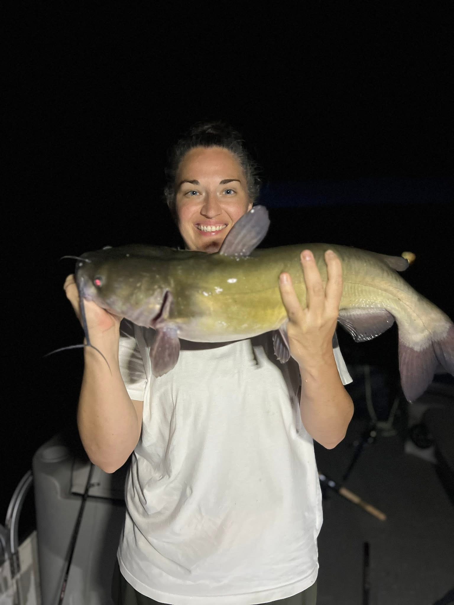 Water temps are holding in the low 80s, but with nighttime lows now in the high 60s we should start to see a steady cooldown. This drop will really kick fishing into gear. A lingering pressure system over the last couple weeks has had the fish grouped up, and now that it’s finally fading, we may see a short adjustment period in the bite—but overall conditions are setting up perfectly for fall fishing. This week was a little lighter on charters, but the bite was excellent! The group of girls from last weekend had such a great time that they came back and extended their trip by an extra hour. We started off chasing stripers in Thompson Bay, marking a solid school just off the buoy line. Jigging and chumming produced a few fish, but the real winner was cut bait. Our rods were rigged with 20 lb braid to a 14" fluorocarbon leader with a small circle hook and a split shot about a foot up. That presentation drew consistent bites. We also dropped bottom rigs with 8/0 and 10/0 circle hooks just a few feet off bottom. That paid off big when Lauren landed a 24" striper weighing just under 3 lbs. For the last couple hours, we switched gears to catfish close to home. Tomi landed a nice channel cat, while Lauren rounded things out with a quality flathead. A great day on the water with plenty of action and memories made!