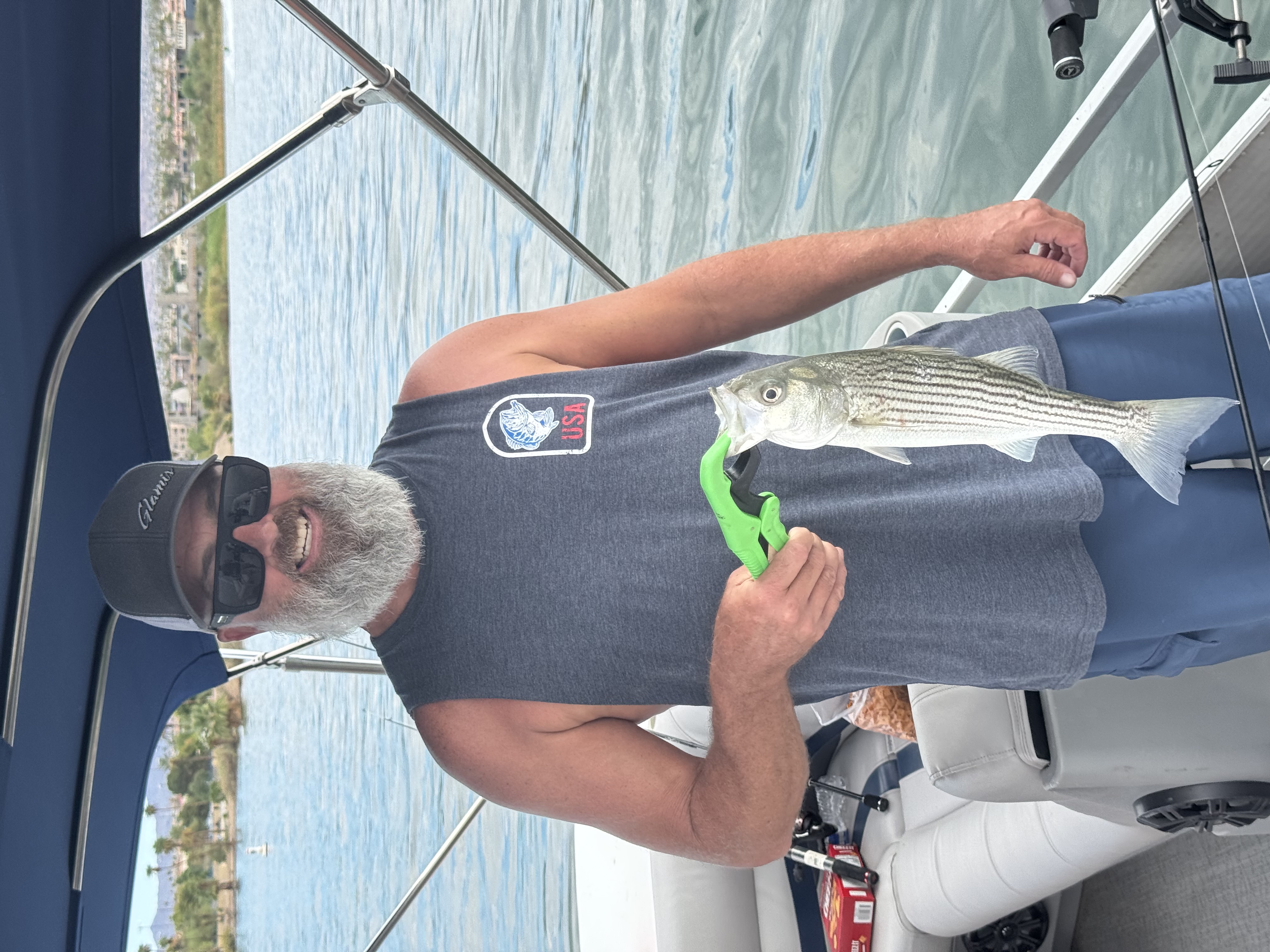 On the water from 5:30–10:00 AM, water temps held steady at 84°F with air temps from 89–100°F. Sunrise was at 5:55 AM, and winds blew 10–15 mph out of the south. Today’s trip was with a fellow licensed boat captain who runs his own wake surf boat here in Havasu—it’s always great having locals aboard! We headed to Blue Dock Cove and trolled through the “Sod Farm” to the White Lighthouse on the island, about a 1.5-mile run. With the south wind, I figured the north side would be more protected, but the bait and stripers were scattered, making for a tougher bite. We ran two different setups at the same time—one rod with a River2Sea D Walker 4.5" Pearl Swimbait on a 1/2 oz jig head, and the other with a 4" fluke for a slimmer profile. Around 7:30, we landed our first 14" striper, quickly followed by another. A few short strikes and lost fish followed before we trolled from Site Six to Body Beach. We landed a 12" striper off the fluke near Beachcomber, but the action picked up again as we neared Thompson Bay. My client hooked a solid 18.5" striper that crushed the D Walker, and later, in the no-wake zone, we doubled up—landing one more 15" fish to wrap up the morning. Conditions were challenging, but persistence paid off, and we had a great time. We’re back at it tomorrow morning—stay tuned for the next report!