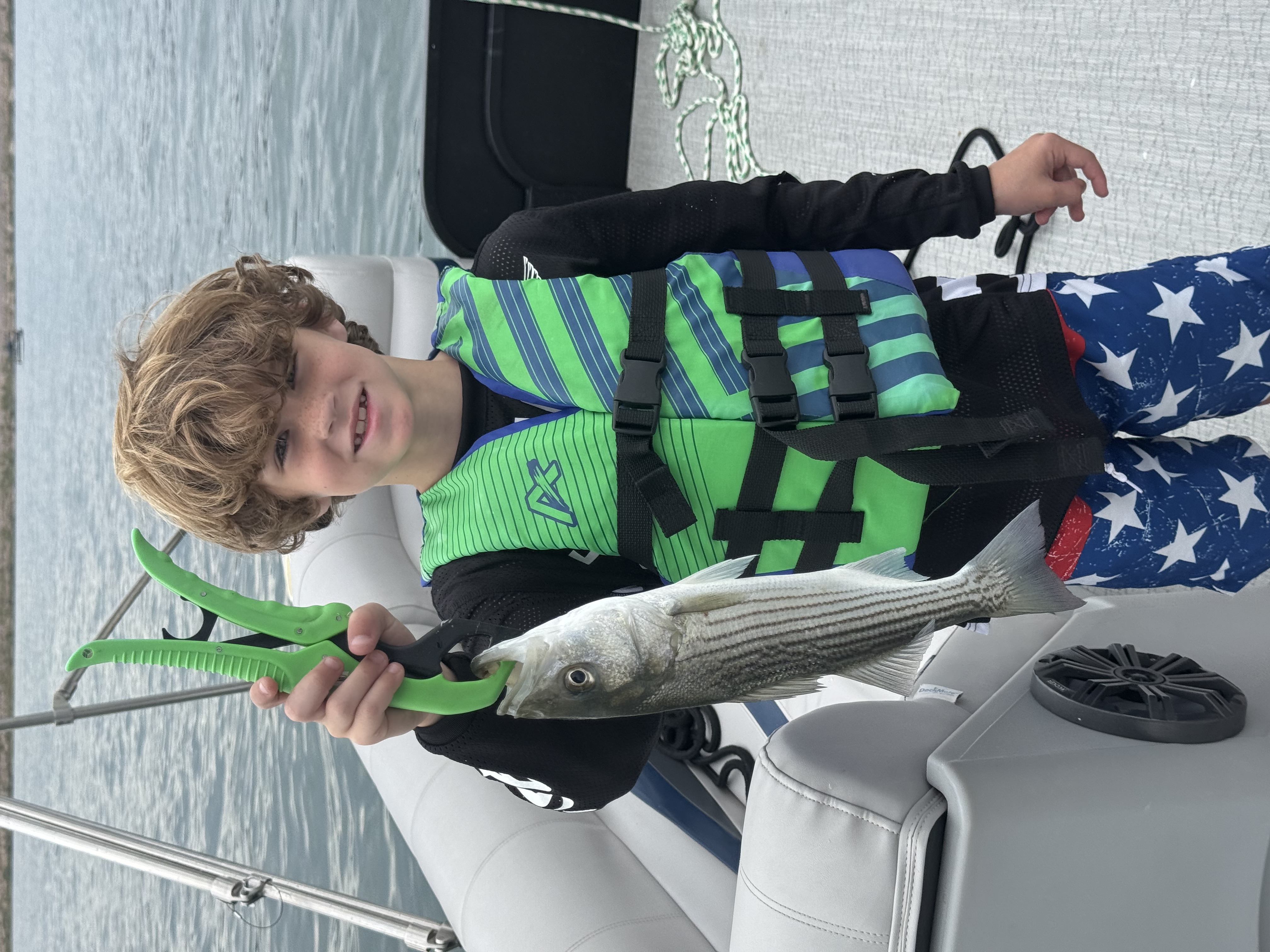 This morning we picked up a husband-and-wife team for a 3-hour striper charter. Conditions were calm with no wind to speak of, water temps holding steady at 81°F, and air temps climbing from 79 into the low 90s after sunrise at 6:25 AM. We started the trip trolling in 25–45 feet of water, running a mix of baits including a lipless crank, a pearl swimbait, and a bucktail & fly combo. The troll was slow, with just one fish coming early on the fly tied just above the bucktail jig. By 7:30 AM, with only one fish in the boat, I decided to switch gears and run to one of my honey holes to anchor up and jig. Once set, we started chumming to pull fish in and quickly had some action going. After a few on jigs, I switched the couple over to fly-lined cut bait, which proved to be the ticket. The bite really picked up, and they steadily put fish in the boat as the morning went on. By the end of the charter, they had landed around 25 stripers and kept 7 quality fish ranging from 14–21". A tough start turned into a solid morning, and our anglers left with big smiles (and dinner!).