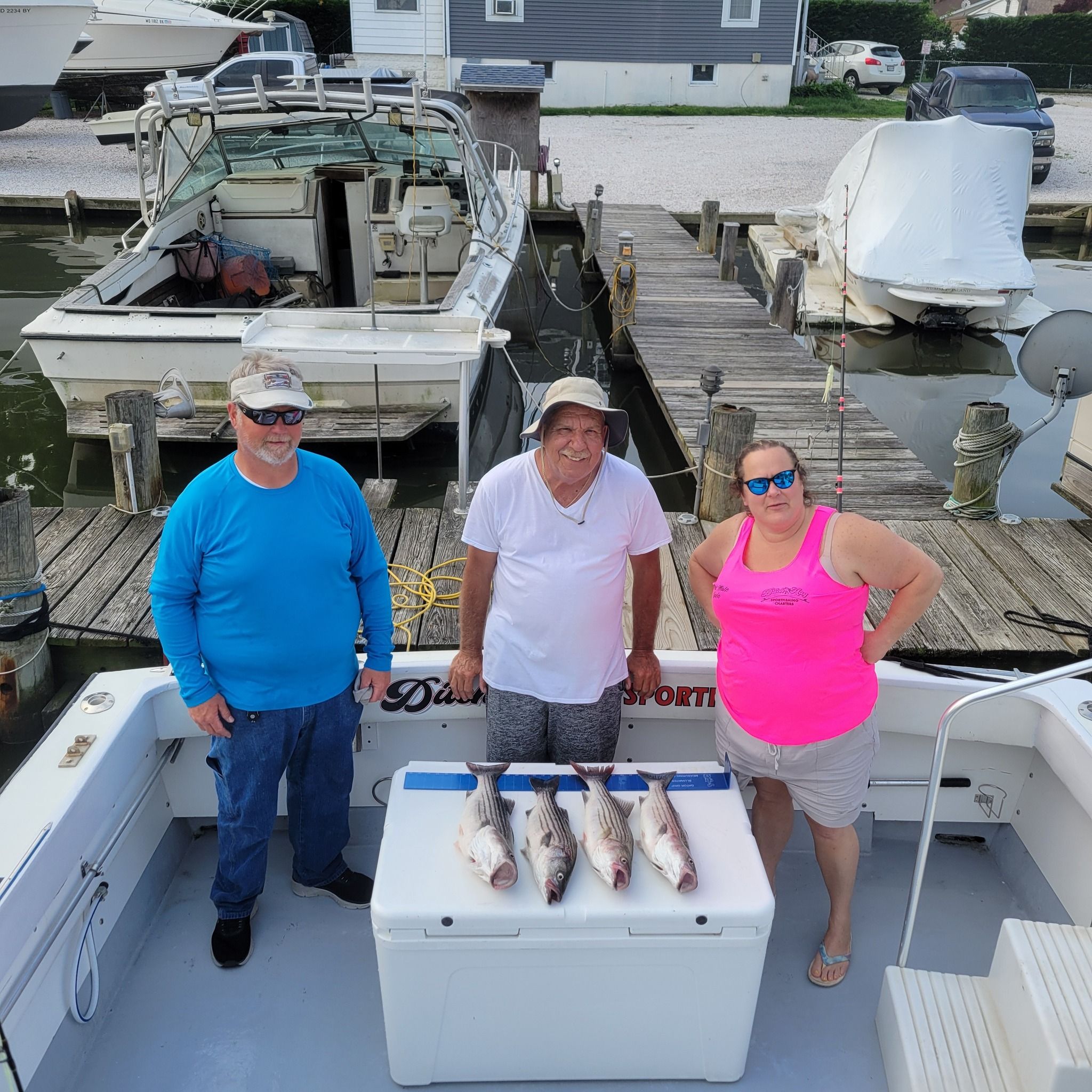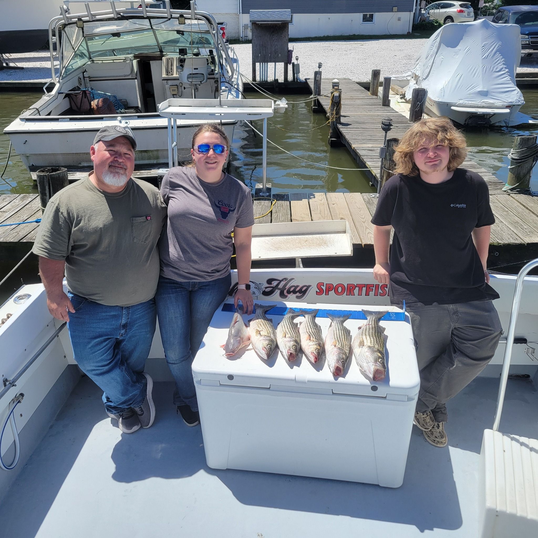 A little rocking and rolling this morning but our crew hung tough. Rock fishing is on fire!!!! Thank you for the trip. We have next Saturday afternoon and Sunday morning open for a full charter. Call or text Capt Gus to book your next adventure on Ditch Hag Sportfishing Charters. 443-730-3214