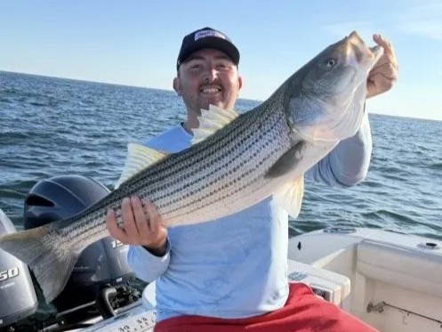 One for the books today! Summer fishing in Yarmouth MA brought us clear conditions and a perfect day on the water. I took Trevor out for a 3/4 day trip with Fishon Fishing Charters, launching early in the morning to hit the Lower Cape. The water was prime for some serious Striped Bass action, and we were ready to make the most of it. With our gear rigged and ready, we set out to try a variety of techniques. We started with some surf casting along the shoreline, then moved to bottom fishing in some promising spots. As the day progressed, we switched it up and did some trolling. Our persistence paid off when Trevor hooked into a solid 27-inch Striped Bass. It was a great catch and definitely the highlight of our trip. We wrapped up feeling good about the day's success and the memories made on the water. Striped Bass fishing in Yarmouth MA can be incredibly rewarding, especially during the summer months. The Lower Cape offers diverse fishing grounds that suit different techniques, from surf casting to trolling. It's this variety that keeps anglers coming back for more, and today's trip with Trevor was a perfect example of why Fishon Fishing Charters is known for delivering the best experience. If you're thinking about coming out for some top-notch Striped Bass fishing, now's the time to book a trip with us at Fishon Fishing Charters. Our 3/4 day charters are ideal for anglers looking to maximize their time on the water and increase their chances of landing that trophy Striper. Whether you're an experienced angler or new to the sport, we've got the knowledge and equipment to put you on the fish. Yarmouth MA is a prime location for targeting Striped Bass, and we know all the hotspots. From surf casting along the beaches to bottom fishing in productive areas and trolling the deeper waters, we'll employ the techniques that are working best on any given day. Summer is peak season for Stripers in the Lower Cape, so don't miss out on this incredible fishing opportunity. Give us a call at Fishon Fishing Charters, and let's get you hooked up with some hard-fighting Striped Bass. Remember, every cast is a chance at that fish of a lifetime, and we're here to make it happen for you. Book your 3/4 day charter now and experience the thrill of Striped Bass fishing in one of New England's premier fishing destinations.
