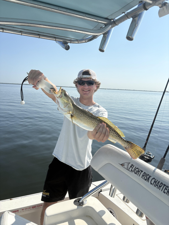 One for the books today! I took Hunter out for some inshore fishing action with Flight Risk Charters off Holmes Beach, FL. Spring was in full swing, and we kicked off our morning adventure under cloudy skies with a bit of early rain. As we set out from Anna Maria Island, the weather started to clear up, giving us perfect conditions for our 4-hour trip. With our gear rigged and ready, we hit some prime spots known for great inshore action. We mixed it up between surf fishing, pier fishing, and wade fishing to cover all the bases. The variety of techniques paid off when Hunter hooked into a nice Spotted Weakfish. After a good fight, we brought in an 18-incher - a solid catch that made our day. We kept at it, working different areas and adjusting our approach as needed. Even though we didn't land any more keepers, the consistent action kept us engaged throughout the trip. We wrapped up our time on the water with smiles all around, satisfied with our success. If you're looking to get in on some exciting inshore fishing action around Anna Maria Island, I'd love to have you aboard Flight Risk Charters. Our 4-hour private inshore trips are perfect for anglers of all skill levels. We'll hit the best spots around Holmes Beach and use a mix of techniques to target species like Spotted Weakfish and other inshore favorites. Whether you're into surf casting, fishing from the pier, or getting your feet wet with some wade fishing, we've got you covered. Spring and early summer are prime times for inshore fishing in our area, with plenty of opportunities to hook into some quality fish. I'll provide all the gear and knowledge you need for a successful day on the water. It's a great way to experience the diverse fishery we have here in Holmes Beach. Don't miss out on the chance to create your own memorable fishing story. Give us a call at Flight Risk Charters to book your own private 4-hour inshore fishing adventure. Whether you're a solo angler like Hunter or bringing a small group, we'll tailor the trip to your preferences and make sure you have a blast fishing the rich waters around Anna Maria Island. Looking forward to seeing you out here and putting you on some fish!