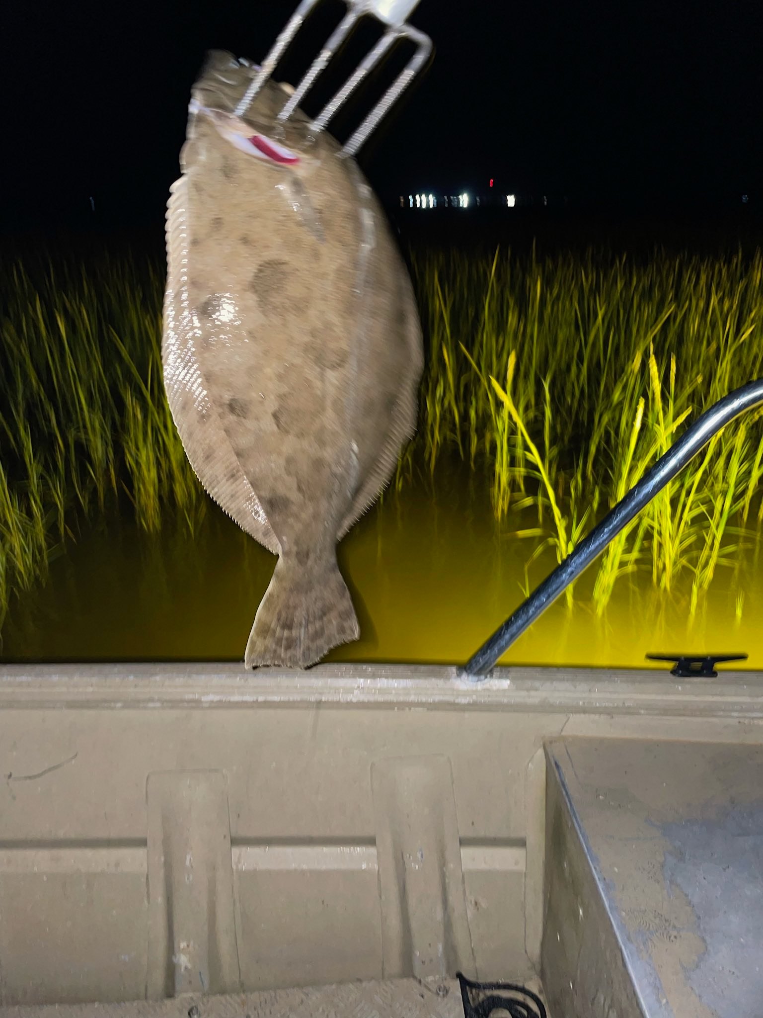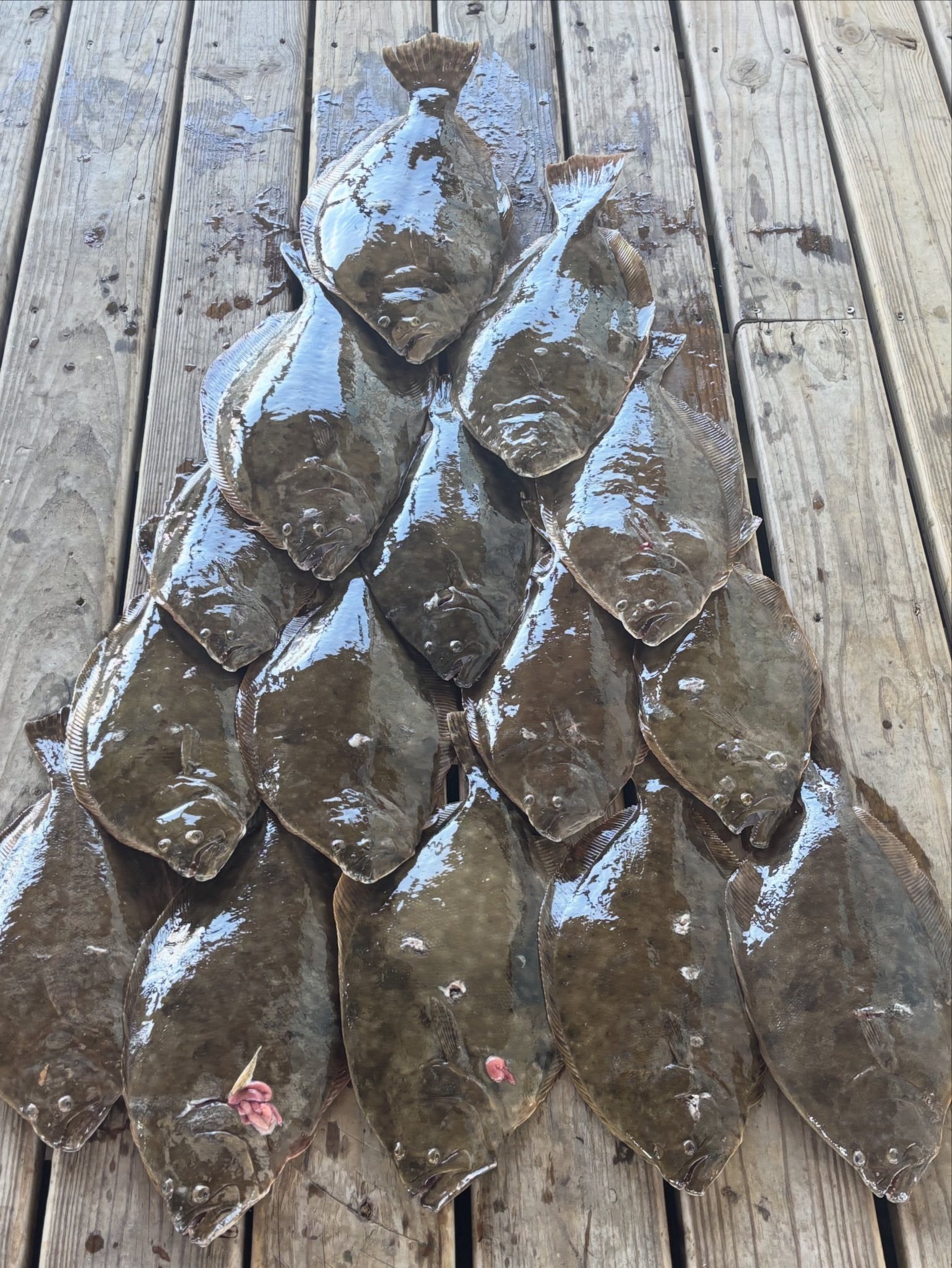 For rod-and-reel fishing, anglers can expect Shimano reels, Falcon rods, and a selection of lures ranging from touts to topwaters, as well as live bait kept fresh with an onboard oxygen system. For gigging, trips include 10’ bamboo gigs, 8’ aluminum gigs, and fishing bows. Guests will also enjoy gigging from a 20’ custom-built flounder boat designed for comfort and success. For those who prefer a more traditional approach, walking gigs and lights are available to stalk flounder on foot.