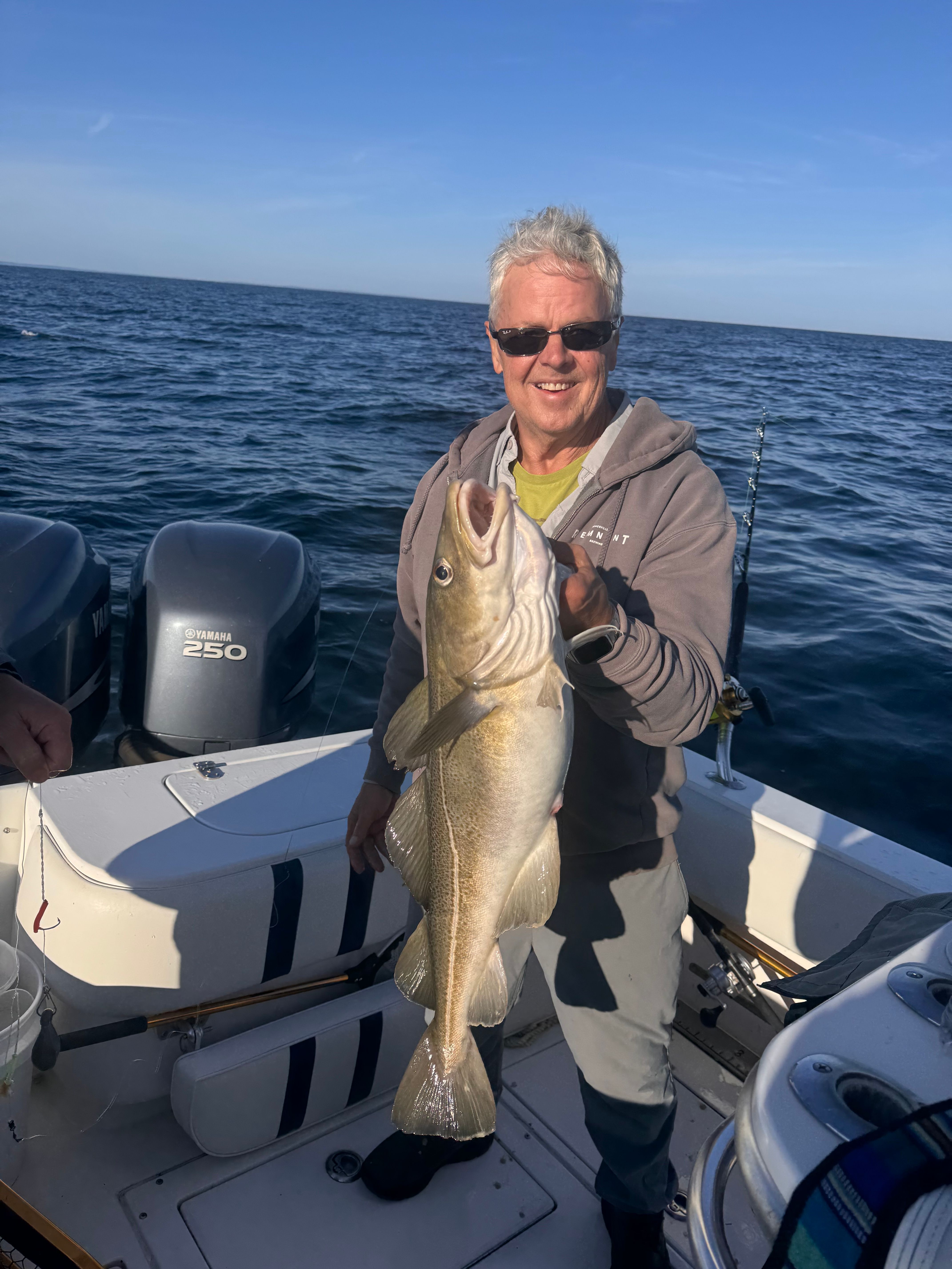 Quality cod such as this 34” as well as hot haddock fishing have par for the course for Legit Fish. Captain Mark Rowell of Legit Fish Charters is finding cod up to 34” and limits of haddock on most trips. That is arguably much better fishing than others are experiencing among more northern offshore structure, such as Jeffrey’s Ledge and Tillies. The key, according to the captain, is to find rocks/wrecks just to the side of soft bottom. Draggers tend to avoid the irregular bottom, which wreaks havoc on their gear, and instead pound muddy/gravely bottom. Clams, as well as pink cod flies/teasers, are doing the job. Ancillary wow moments continue aboard Legit Fish with a noteworthy one happening while the crew was trying to put a patron onto a blue shark. While setting out a chum slick, and as the blue sharks began to get close to the boat, an unforeseen mako exploded out of nowhere and slammed the bait. The takedown was ferocious and furious, but unfortunately, the fight short lived. Without a doubt, that angler will be booking another trip soon. "on the water"