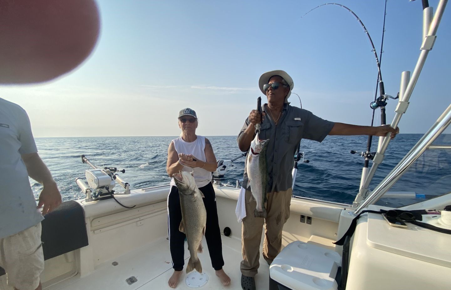 Lake Trout fishing has been excellent this week! We've been catching lots of fish, and they're big. Kyle says that they're catching fish up to 20 pounds, and he's got a few photos to prove it. The weather has been perfect and the water is clear and warm—a perfect day for fishing.