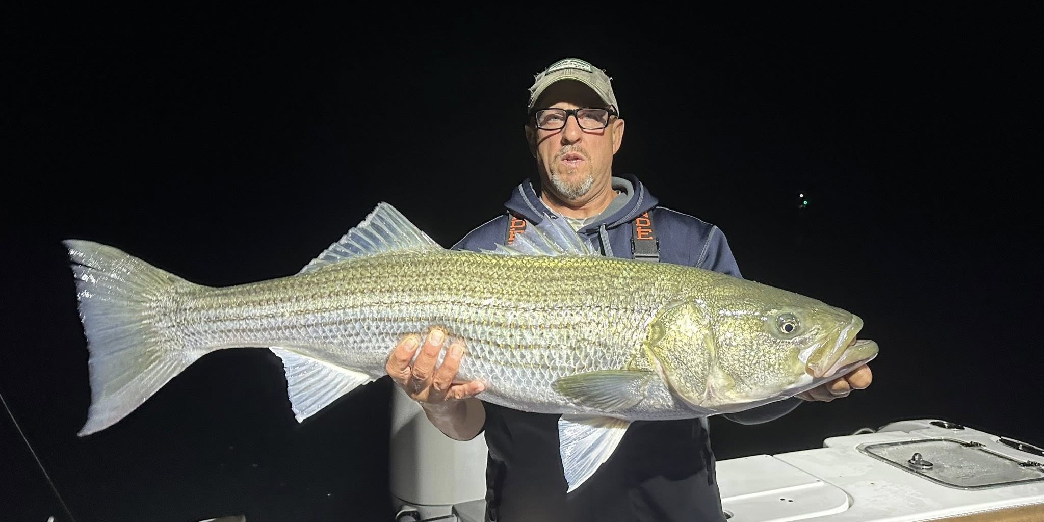 34 yrs Married and together for 40. Andy and Patti had a helluva Anniversary night With 25 over 40”s Andy with his PB 47.5” Thanks for spending your special night with us !! “ That was the best Striper fishing trip I’ve been on” Andy said.