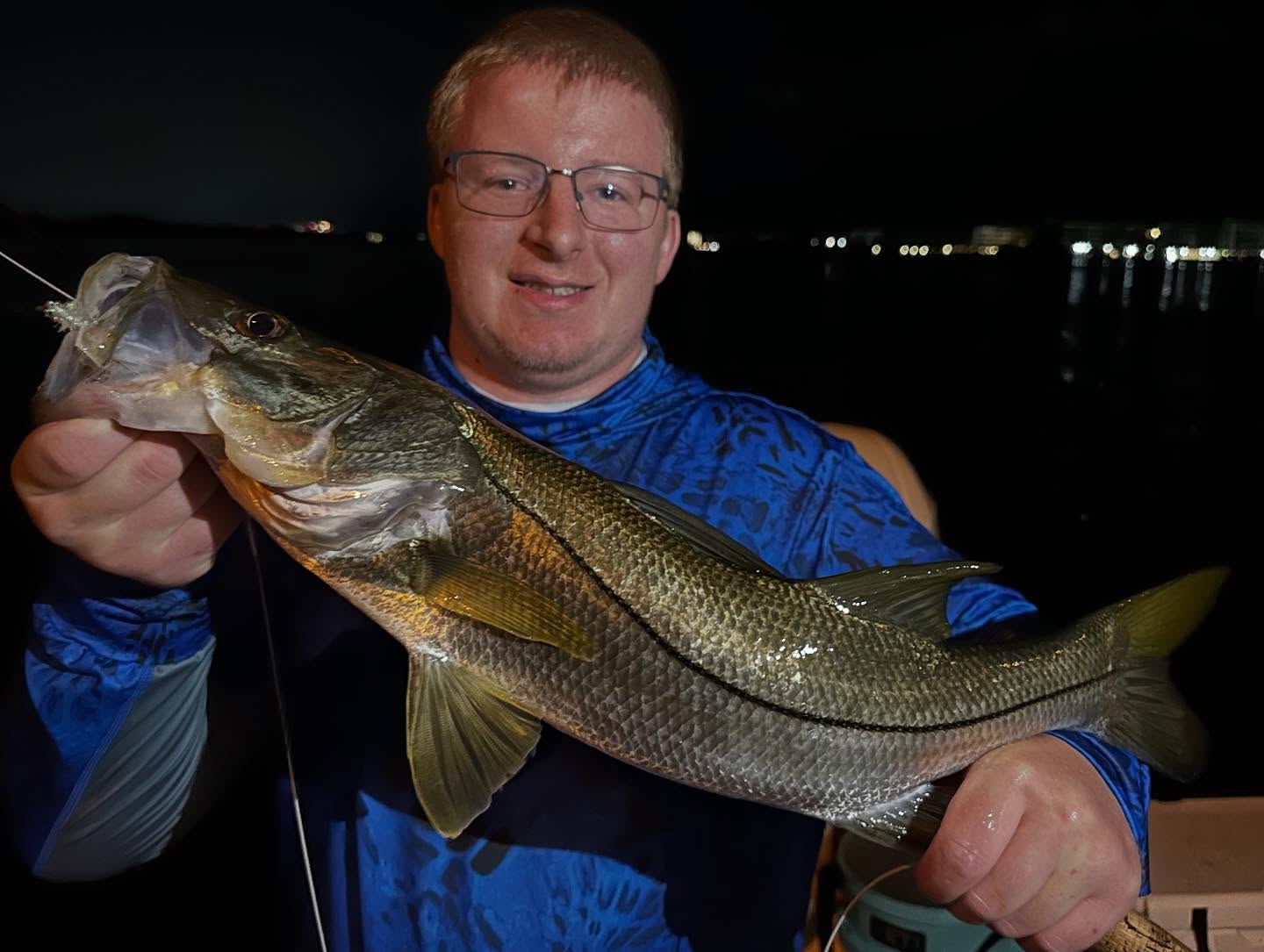 In addition to freshwater trips, we offer nearshore saltwater charters targeting snook, tarpon, jack crevalle, and sharks. One of our specialty offerings is nighttime snook fishing—a favorite for anglers who want to beat the heat and enjoy an exciting bite around lighted docks and bridges. These night trips offer fantastic sight-fishing opportunities, with fish actively feeding on small baitfish drawn to the lights. Light spinning gear or fly rods (6wt–8wt) with clouser minnows or baitfish patterns are perfect for this style of fishing.
