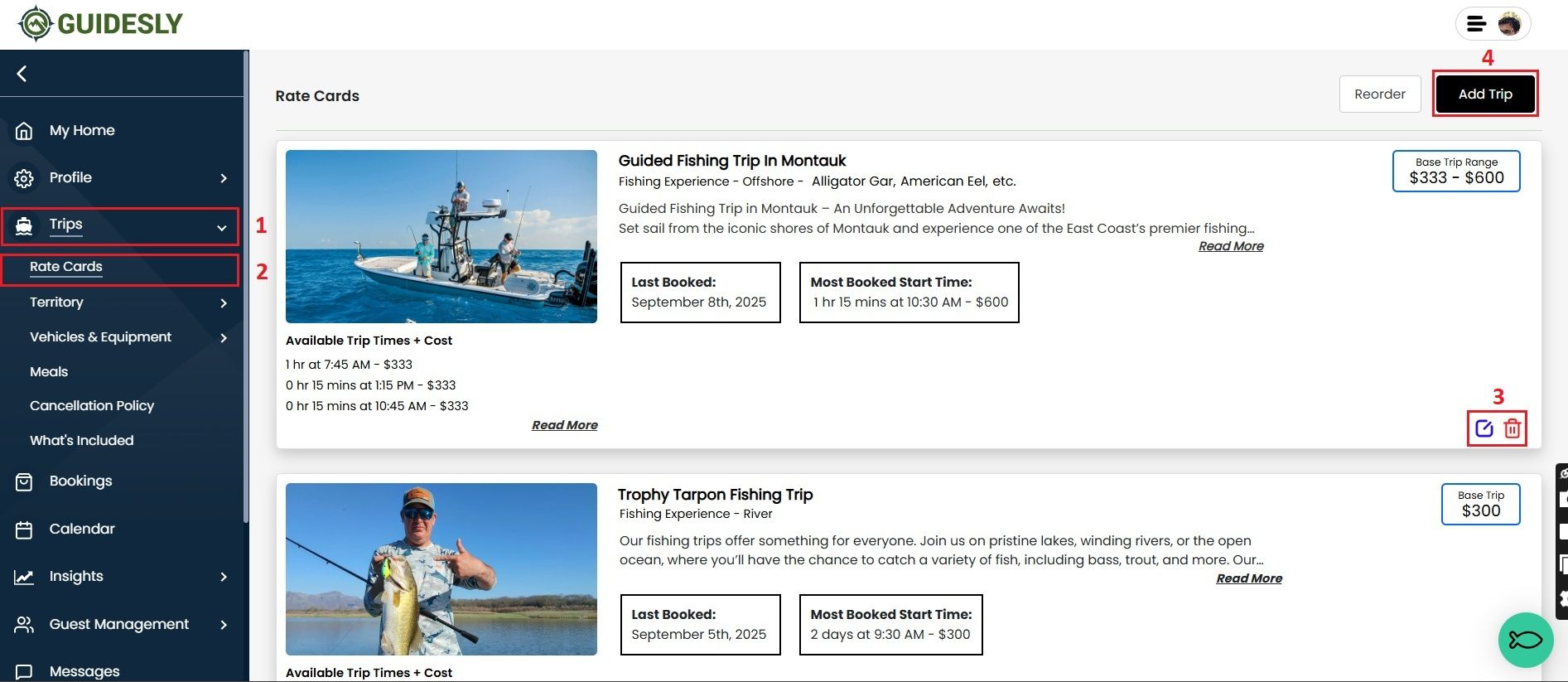 We get it, trips and rates can change as your business grows. Guidesly makes it easy for Captains and Guides to update their offerings through the Rate Cards section of your Profile. Making updates to existing Rate Cards and adding new Rate Cards can be done on both Guidesly.com and through the Guidesly Pro App.